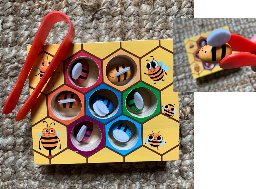 Easy-Play Board Game. Just grab the plastic pinchers, and remove each little bee from its honey comb. Builds confidence and coordination. For ages 2-5, and must be played under adult supervision (as baby bees present possible choking hazard). |